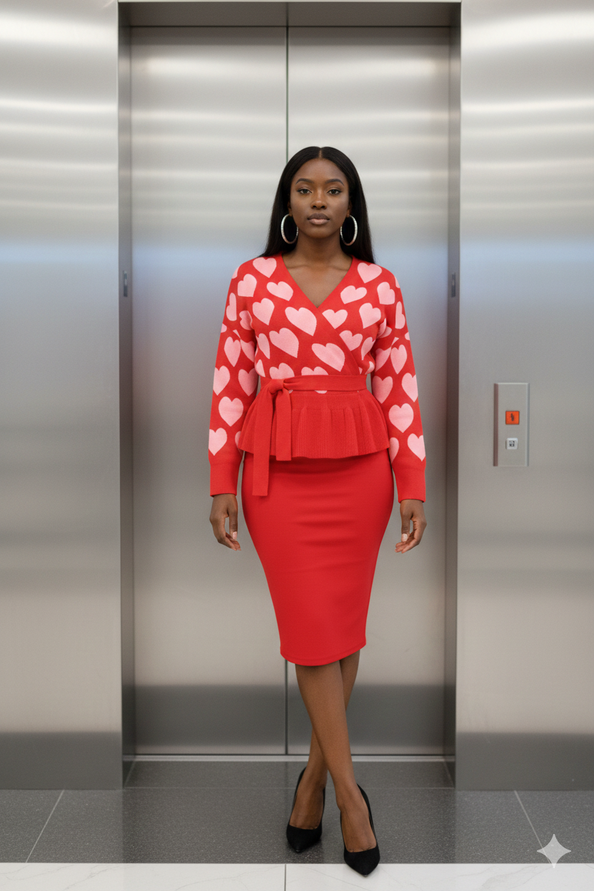 Fall in love with this flirty favorite. Our Heart Print Baby Doll Sweater brings a playful touch of romance to your wardrobe with its soft pink heart pattern against a bold red backdrop. The wrap-style front and tie waist create a flattering, feminine silhouette, while the subtle peplum hem adds that perfect touch of flirt and flair.